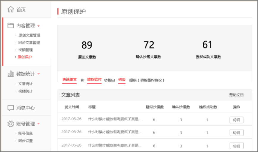一點(diǎn)號、鳳凰號為自媒體用戶提供原創(chuàng)文章版權(quán)保護(hù)功能。 其中,鳳凰號將于月末開啟維權(quán)賠付功能,通過后臺監(jiān)測200+主流平臺,對侵權(quán)抄襲行為一查到底替作者維權(quán)。未來一點(diǎn)號、鳳凰號將會全力打造原創(chuàng)優(yōu)質(zhì)內(nèi)容的版權(quán)保護(hù)平臺及監(jiān)測網(wǎng)絡(luò),對于站內(nèi)文章被站外的抄襲也會進(jìn)行相關(guān)維權(quán)工作。