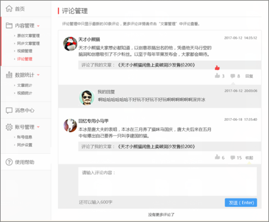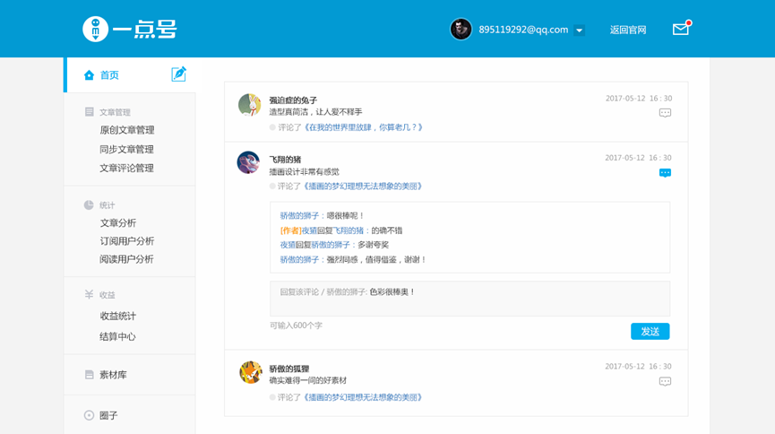 本次積分系統(tǒng)升級之后,一點(diǎn)號、鳳凰號的作者將會更方便快捷的在后臺查看用戶評論,參與用戶討論回復(fù),點(diǎn)贊自己欣賞的讀者評論,能夠更全面更多元化的與讀者進(jìn)行互動。