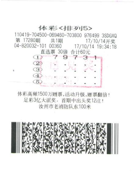 [摘要] 10月14日晚開獎的排列五第17280期,全國共開出一等獎47注,位于河南汝州市老消防隊東100米的4104820032101網點彩民中得35注,其中30注被彩民童先生中得。