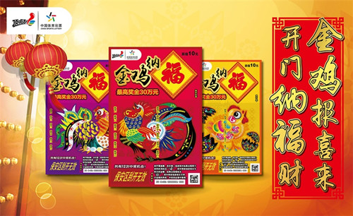 每逢歲末年初,頂呱刮都會推出賀歲票,今年也不例外,雞年賀歲票“金雞納?!碧崆芭c彩民們見面了。該票有紅、紫、黃三款,以寓意吉祥如意的錦雞為主題,絢麗的色彩中透露出濃濃的中國風。單張面值10元,有12次中獎機會,最高獎金30萬元,游戲形式為:刮開覆蓋膜,在任意一場游戲中如果出現(xiàn)兩個相同的“雞”標志,即中得該場游戲右方所示的金額;如果出現(xiàn)“福”標志,即中得該場游戲右方所示金額的兩倍。