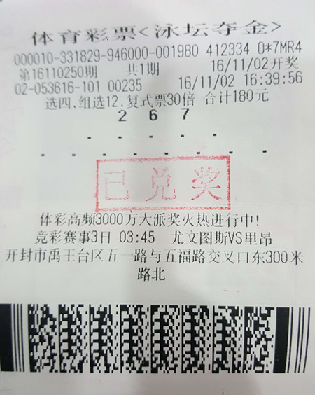 11月4日下午,開封市五一路與五福路附近的體彩網點,彩民劉老太太出手投注,竟幸運地“奪金”萬元。原來,當時河南體彩高頻游戲“新快贏481”(泳壇奪金)在派獎期間,進行了嘉年華及網點現場培訓活動,進店有禮和派送活動吸引了許多不懂彩票的市民參與其中。其玩法簡單、中獎率高、快速開獎、投注方法多等亮點,受到了廣大彩民的青睞,劉老太太就是在這段時間里才了解并參與了進來。