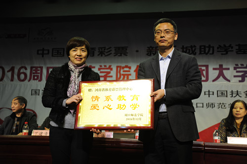 與會領(lǐng)導(dǎo)向周口師范學(xué)院受助學(xué)生代表發(fā)放5000元助學(xué)金