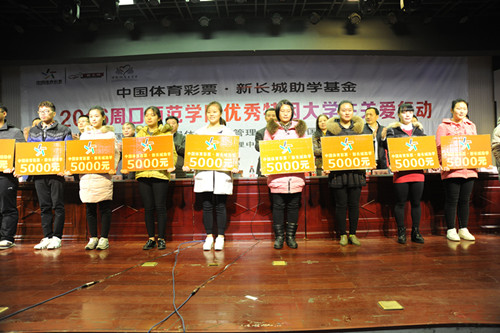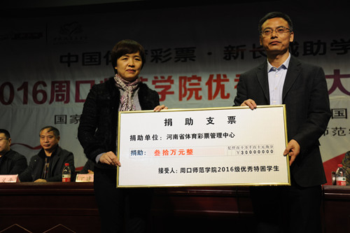 2016年12月7日、8日,中國體育彩票品牌公益項(xiàng)目“中國體育彩票新長城助學(xué)基金”2016年捐贈儀式分別在商丘師范學(xué)院和周口師范學(xué)院舉行。據(jù)悉,通過此次捐贈活動,河南省體育彩票管理中心共向兩個(gè)學(xué)校來自全國14省區(qū)的120名優(yōu)秀貧困大學(xué)生每人捐助5000元,幫助他們和他們的家庭,減輕學(xué)習(xí)生活中的經(jīng)濟(jì)負(fù)擔(dān)。