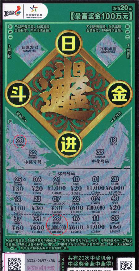 “日進斗金”面值20元,共有三個游戲。游戲一和游戲二,刮開覆蓋膜,如果出現(xiàn)金額標(biāo)志,即中得該金額;游戲三:刮開覆蓋膜,如果你的號碼中任意一個號碼與中獎號碼之一相同,即中得該號碼下方所示的金額;如果出現(xiàn)銅錢標(biāo)志,即中得該標(biāo)志下方所示金額的3倍;如果出現(xiàn)元寶標(biāo)志,即中得該標(biāo)志下方所示金額的5倍。