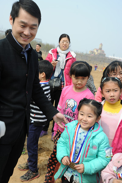 河南省體育彩票管理中心副主任韓宇為參加植樹(shù)的小朋友頒發(fā)獎(jiǎng)牌