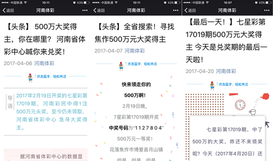 大獎中出之后,中獎人一直沒有到河南省體彩中心兌獎,而60天的兌獎有效期卻在一天一天流逝,眼看2017年4月20日的最后兌獎期限將至,為了更好的保護(hù)彩民利益,省體彩中心自2017年4月6日開始,通過省市網(wǎng)絡(luò)、報(bào)紙、廣播、官微、體彩銷售網(wǎng)點(diǎn)廣播消息和尋人啟事等多種形式發(fā)布消息,努力尋找和提醒中獎得主。