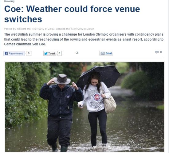 英國(guó)奧委會(huì)主席塞巴斯蒂安-科表示,降雨已對(duì)后勤方面造成很大的問(wèn)題,而盡快想出應(yīng)對(duì)方法和緊急方案也被提上日程。他同時(shí)承認(rèn),賽艇比賽和馬術(shù)比賽是本屆奧運(yùn)會(huì)比賽的兩個(gè)主要室外項(xiàng)目,而由于場(chǎng)地構(gòu)造這兩個(gè)地點(diǎn)非常容易受陰雨天氣的影響。