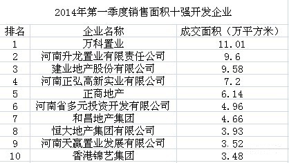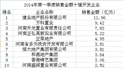 建業(yè)地產(chǎn)股份有限公司以11.96億元的銷售金額高居榜首,成為2013年一季度商品住宅企業(yè)銷售金額冠軍。萬(wàn)科置業(yè)、河南升龍置業(yè)以9.42億元和7.83億元緊隨其后,分列亞軍和季軍。第四至第十名為河南正弘高新實(shí)業(yè)有限公司(5.22億元)、正商地產(chǎn)(4.95億元)、河南省多元投資開發(fā)有限公司(3.81億元)、恒大地產(chǎn)集團(tuán)有限公司(3.81億元)、和昌地產(chǎn)集團(tuán)(3.64億元)、香港錦藝集團(tuán)(3.06億元)、河南盛潤(rùn)置業(yè)有限公司(2.92億元)。