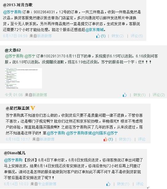 而另有很多消費者則選擇把自己在蘇寧易購的消費經(jīng)歷寫在網(wǎng)上,來表示對蘇寧易購的不滿。一位上海的網(wǎng)友表示,自己在12號購買了三件商品,收到一件商品竟然是次品,換貨時客服竟然建議他去青島門店鑒定,多次溝通后說可以郵件發(fā)送照片申請換貨,但至今都無人聯(lián)系他。另外兩件商品一直是提交訂單狀態(tài),客服告訴他生成發(fā)貨單還需要72個小時才能給處理。