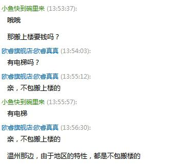 據(jù)小編調(diào)查發(fā)現(xiàn)(如下圖),部分商家表示免費送貨,但卻不送上樓,上樓需要額外支付搬運費;也有部分商家是按樓層高低收費,如:三樓以下不收“上樓費”,三樓以上,收費按樓層高度遞增。這個問題消費者一定要與客服交流清楚,否則商品運來了,還要掏錢才能進屋,或者要自己動手搬,麻煩就大了。