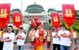 大紅花轎、鳳冠霞帔、媒婆丫鬟……昨天上午,重慶人民廣場上,喜慶的鑼鼓、嗩吶聲吹得熱鬧,一支特殊的迎親隊伍引來了眾多市民的圍觀。
