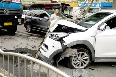 本報訊 昨日上午8點40分左右,華山路隴海路口東北角發(fā)生一起交通事故,一輛沿華山路由南向北直行的北京現(xiàn)代白色轎車在過路口時,突然失控撞到一輛路口等紅燈的淺灰色東風(fēng)本田,被撞本田轎車在巨大沖擊力下向后退去,又導(dǎo)致后面6輛轎車連撞受損。