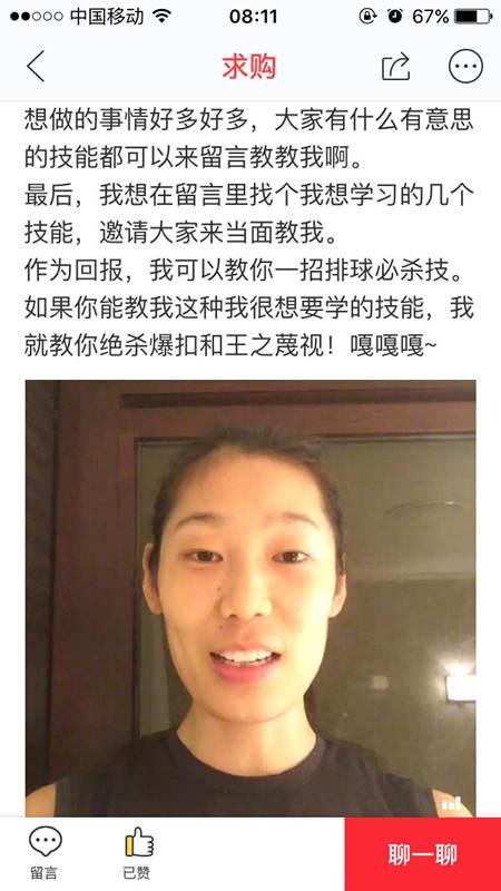 此外,“我馬上要去的土耳其,有沒有人給我介紹一下這個(gè)國家,教教我土耳其語,或是誰知道土耳其有什么好吃好玩的,也可以告訴我啊?!睋?jù)了解,在朱婷赴土耳其出發(fā)前,將會(huì)在其中挑選一位網(wǎng)友進(jìn)行技能互換。