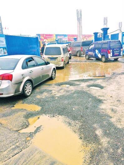 鄭州農業(yè)路與沙口路附近的保通路上,交叉口東西兩側各有一處較大的深坑。西側一處深約20厘米,不少電動車主行至坑邊,不敢涉水通過,只能擠進快車道行駛,非常危險;東側一處大坑面積約60平方米,水坑最深處可達30厘米,私家車從此經過,濺起一片水花。該大坑正處一個丁字路口正中央,且沙口路、農業(yè)路的車輛僅有此處一條通道,因車輛通行緩慢,路面私家車排起一條長龍。