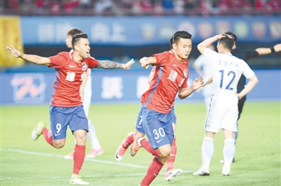 建業(yè)隊(duì)員慶祝進(jìn)球 記者 李 焱 攝