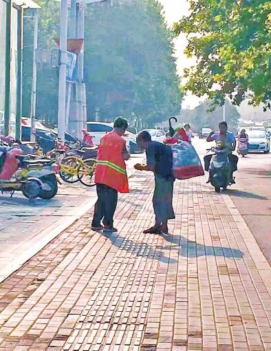 發(fā)生在鄭州金水路街頭的這一幕,剛好被市民拍到。昨日在網(wǎng)絡上發(fā)布后,感動了很多網(wǎng)友。62歲的女環(huán)衛(wèi)工事后說:“這是應該的,是小事,不值得宣傳?!备浇熳R她的人說,這名環(huán)衛(wèi)工是個熱心腸,之前已經(jīng)多次給流浪人員買飯、送水、送餐。