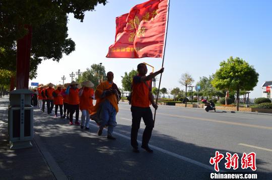 圖為朝圣團(tuán)一行30人在少林寺延偵法師、延宗法師的帶領(lǐng)下,徒步行腳?!∩倭炙鹿﹫D 攝圖為朝圣團(tuán)一行30人在少林寺延偵法師、延宗法師的帶領(lǐng)下,徒步行腳?!∩倭炙鹿﹫D 攝