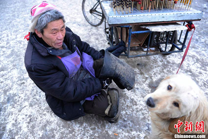 2月6日,在長春市一條繁華的街路上,一只小狗幫助身殘主人拉車賣冰糖葫蘆,成為長春冬日街頭一道感人的風景線。據(jù)主人介紹,雖然自己身殘且貧窮,但并不想靠別人救濟度日,因此學會了制作冰糖葫蘆的手藝,并以此自食其力。而他養(yǎng)的這條小狗“大黃”也是對主人不離不棄,每日都會幫助主人拉車外出謀生。圖為主人在賣冰糖葫蘆時,小狗乖乖的守在車旁。張瑤 攝