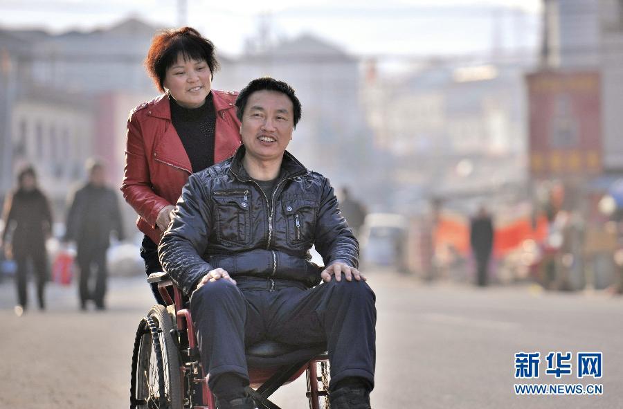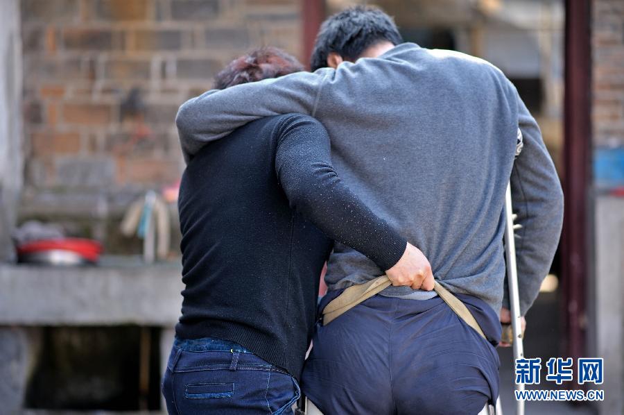 一個(gè)妻子不離不棄的感人故事,在安徽省舒城縣曉天鎮(zhèn)幾乎家喻戶曉。 2006年初夏,曉天鎮(zhèn)街道的汪世俊在安裝廣告牌時(shí),不幸從腳手架上摔了下來(lái),造成下肢癱瘓。妻子張先琴始終不離不棄,8年如一日,未曾走過親戚,出過遠(yuǎn)門。丈夫癱瘓后的頭3年里,每隔半個(gè)鐘頭就要翻一次身,還需要及時(shí)更換尿布,張先琴?zèng)]有睡過一個(gè)安穩(wěn)覺。為了防止肌肉萎縮,張先琴想辦法將繩子系在丈夫腰間,協(xié)助他進(jìn)行康復(fù)訓(xùn)練。從一個(gè)健全人變成殘疾人,巨大的心理落差使汪世俊脾氣變得暴躁,他常常發(fā)無(wú)名火,可每每這時(shí),張先琴總能默默忍受。張先琴說(shuō):丈夫能有說(shuō)有笑,沒有失去生活的信心,這比什么都重要。 新華社發(fā)(呂務(wù)農(nóng) 攝)