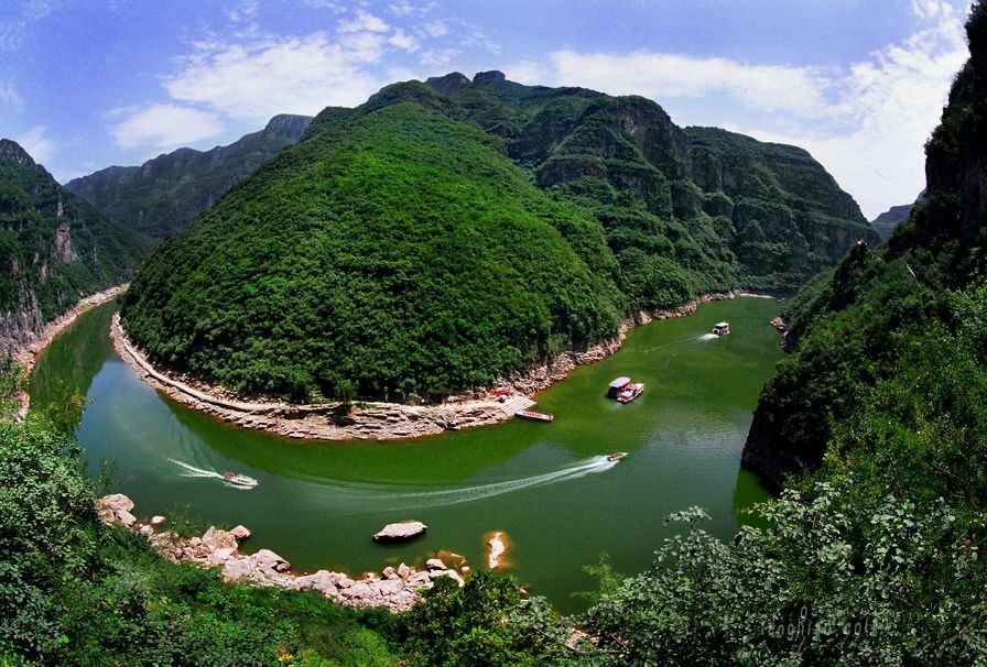 青天河濱水棧道全長8000米,沿大泉湖西岸而建,依山就勢,臨水傍湖,為游客近距離觀賞大泉湖、駱駝峰、千奇洞、鯨魚灣等精品景點提供了便利。沿棧道前行,可以穿深峽、探幽谷、覓奇洞,移步換景,峰回路轉,偶爾幾掛飛瀑,驀然一處險峰,一山一天地,一灣一境界。穿行于棧道,恰似穿行于一條奇妙的丹青畫廊,聽山水清音,賞湖光山色,歷人間仙境,覓世外桃源,于你是一次物我兩忘的精神之旅。