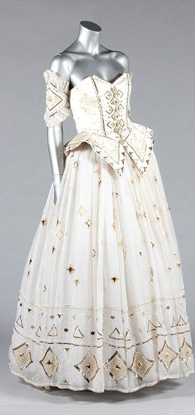 據(jù)悉,該款禮服正是出自王妃曾經的婚紗設計者伊曼紐爾夫婦(David&Elizabeth Emanuel)之手。該禮服在1986年時被推出,是一條飾滿了金片、水晶和珠串的精美華服。由于王妃曾在較短時間內三次穿著該禮服出席公眾場合,因此世人皆認定這是王妃最鐘愛的服裝。