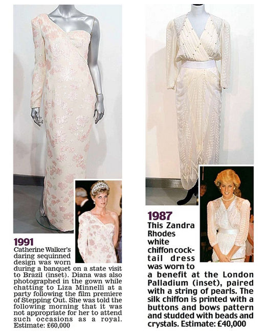 右:Zandra Rhodes白色雪紡禮服。1987年5月,戴安娜王妃穿著這條禮服在倫敦出席公益活動。估價:4萬英鎊