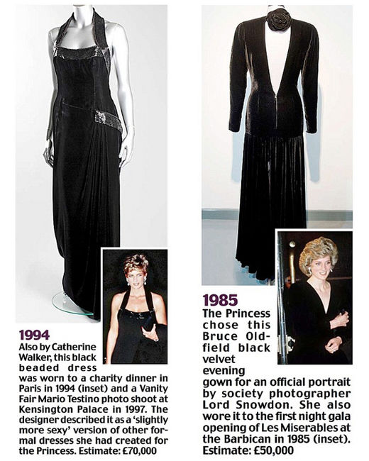 左:Catherine Walker黑色天鵝絨禮服。1997年,攝影大師Mario Testino為戴安娜王妃在肯辛頓宮拍攝的《名利場》大片中,她就穿著這件禮服。估價:7萬英鎊
