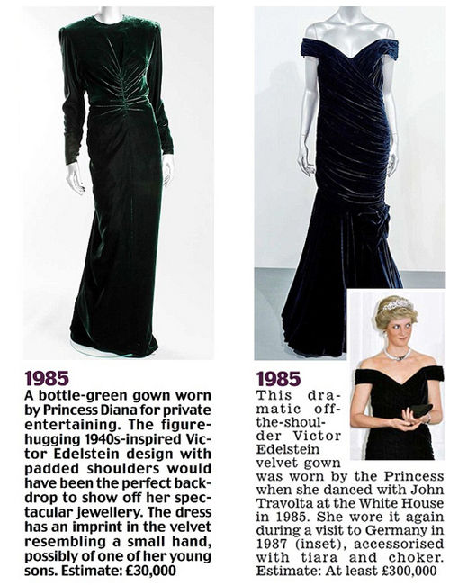 左:Victor Edelstein綠色天鵝絨禮服。1985年出席私人聚會時,戴安娜王妃穿著這條禮服。估價:3萬英鎊