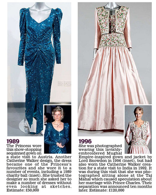 右:Catherine Walker酒紅色刺繡禮服。1992年,戴安娜王妃訪問韓國的時候穿著這件禮服。估價:6萬英鎊