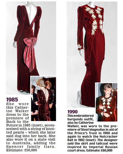 左:Catherine Walker酒紅色天鵝絨禮服。戴安娜王妃曾穿著它訪問澳大利亞,1985年出席電影《回到未來》的首映禮時也同樣穿的這件禮服。估價:5萬英鎊