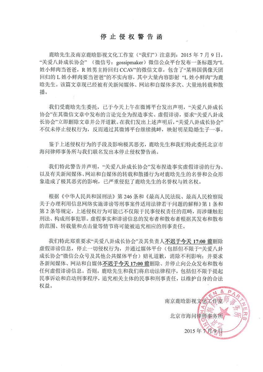 7月9日,關(guān)于“關(guān)愛八卦成長協(xié)會”微信公眾號發(fā)布“L姓小鮮肉當(dāng)爸爸”一文,影射鹿晗先生一事,鹿晗工作室發(fā)律師函否認(rèn)并警告其造謠生事,稱:“我們受鹿晗先生委托,已于今天上午在微博平臺發(fā)出聲明,“關(guān)愛八卦成長協(xié)會”在其微信文章中發(fā)布的言論完全為捏造誹謗,要求‘關(guān)愛八卦成長協(xié)會’立即刪除文章并公開道歉。在我們發(fā)出上述聲明后,‘關(guān)愛八卦成長協(xié)會’不僅未停止侵權(quán)行為,反而通過其微博平臺繼續(xù)挑釁,映射明星隱婚生子一事,鑒于行為惡劣,發(fā)出警告函?!?/p>