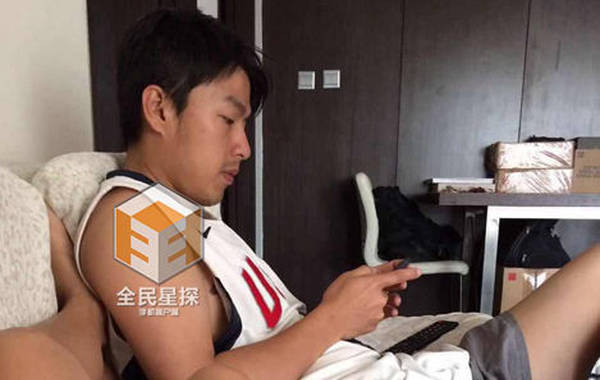 圖中,一雙女人的美腿入鏡,李威坐在沙發(fā)上,眼神一刻不離手機(jī)屏幕。(圖文來自:全民星探app)