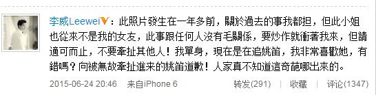 6月24日晚,李威發(fā)布微博回應(yīng)“照片門”,表示“此照片發(fā)生在一年多前,關(guān)于過去的事我都擔(dān),但此小姐也從來不是我的女友,此事跟任何人沒有毛關(guān)系,要炒作就沖著我來,但請(qǐng)適可而止,不要牽扯其他人!我單身,現(xiàn)在是在追姚笛,我非常喜歡她,有錯(cuò)嗎?向被無故牽扯進(jìn)來的姚笛道歉!人家真不知道這奇葩哪出來的。”