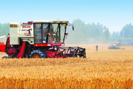 6月9日,收割機(jī)正在延津縣搶收小麥。豫北小麥每年收割較晚,單產(chǎn)最高,今年產(chǎn)量有望好于去年。記者 王天定 攝