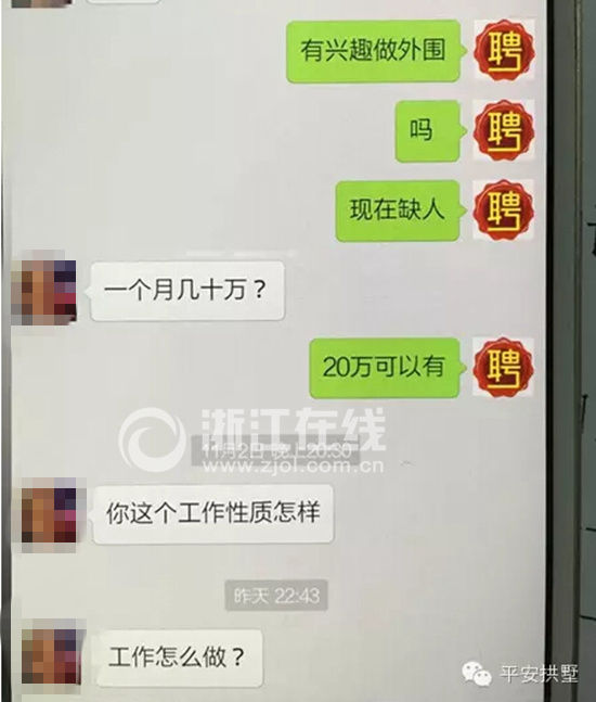 這個人自稱“安遠(yuǎn)”,在微信里直接問趙小姐是否想做“外圍女”賺錢,還特意提到收入頗豐。她想了想,回復(fù)了三個字:有興趣。然后,兩人留了電話,約定再聯(lián)絡(luò)。