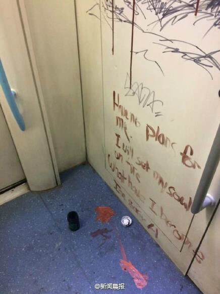 本整潔的地鐵車廂內(nèi)壁,被畫上了“半裸人體”的涂鴉,還用紅色顏料配上了酷似流血的圖案,看起來頗觸目驚心。發(fā)現(xiàn)這一“作品”后,地鐵運(yùn)營方立刻報(bào)警。昨天下午,涂鴉的始作俑者被找到,是一名17歲的外籍少年,隨父母在滬生活?! ?/p>