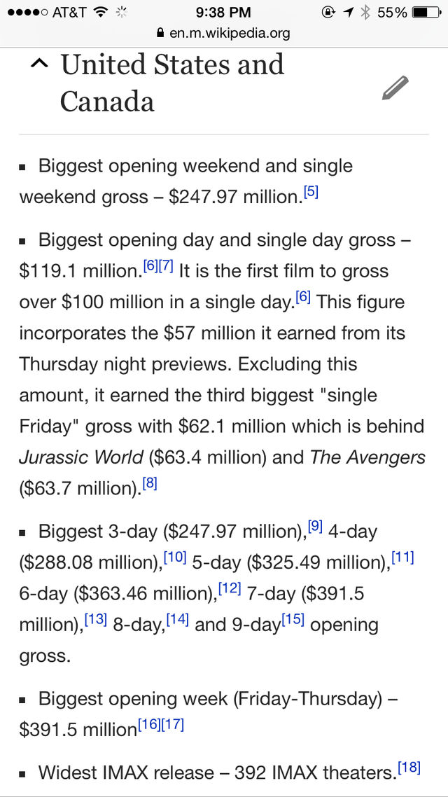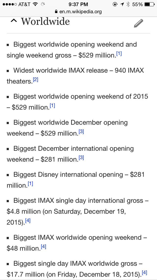 截圖只占該詞條的五分之一都不到哦,這齊刷刷的一片 Biggest/ Widest 真是氣壯山河??!預計到本周末《星戰(zhàn)7》將在北美拿下5億票房,比前任紀錄保持者《侏羅紀世界》快了近整整一倍之多!”票房記錄粉碎機“之稱果然名副其實!