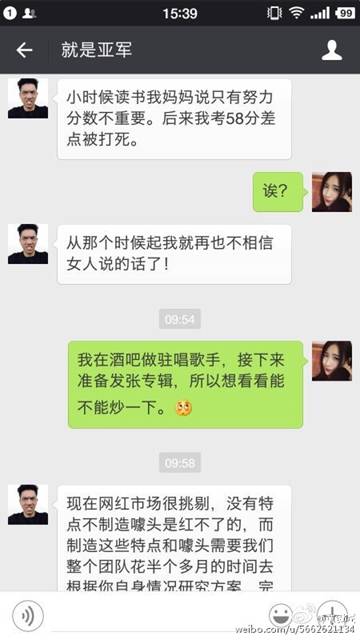 6月6日,某酒吧駐唱女歌手通過(guò)自己的微博發(fā)布了幾張聊天截圖。聊天內(nèi)容大意是酒吧駐唱女歌手找了一位可以網(wǎng)紅經(jīng)紀(jì)人,期望他能夠把自己炒成網(wǎng)絡(luò)紅人,而每次推成功一次紅人,大概費(fèi)用至少是20萬(wàn)起。