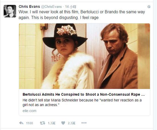 《美國(guó)隊(duì)長(zhǎng)》克里斯·埃文斯(Chris Evans)也表示:“天啊,我再也無(wú)法像過(guò)去那樣看待這部片子、貝托魯奇或白蘭度,這已經(jīng)超越了惡心,我覺(jué)得很憤怒!”他的發(fā)文也引來(lái)許多網(wǎng)友認(rèn)同,連《歌喉贊》女主角安娜·肯德里克(Anna Kendrick)也在底下回應(yīng)表示,“施耐德女士之前曾在訪談中說(shuō)過(guò),‘我曾提起過(guò)這件事情,聽(tīng)的人(男人們)還翻白眼’?!?/p>