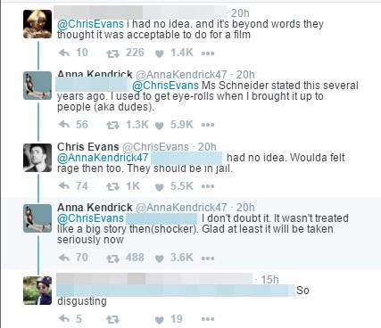 克里斯·埃文斯回應(yīng)安娜·肯德里克的留言稱,自己以前并沒(méi)有看過(guò)該篇訪談,如果那時(shí)候看到的話,應(yīng)該也會(huì)覺(jué)得很憤怒,“他們都應(yīng)該進(jìn)監(jiān)獄?!边@也引起了安娜的共鳴,她也非常慶幸以前并沒(méi)有受到關(guān)注的新聞,如今可以再次浮上臺(tái)面讓大家看到。