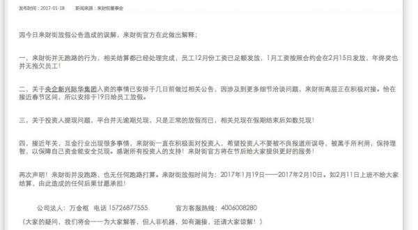 聲明還表示,央企入股更多細(xì)節(jié)洽談問題,來財(cái)街高層正在積極對(duì)接,恰在接近春節(jié)區(qū)間,所以安排于19日給員工放假。聲明還聲稱平臺(tái)并無逾期兌現(xiàn),假期后會(huì)如數(shù)兌現(xiàn)。