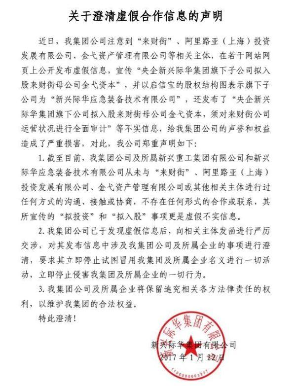 對(duì)于這一“抱大腿”的行為,新興際華1月22日在其官網(wǎng)發(fā)布《關(guān)于澄清虛假合作信息的聲明》,稱“央企新興際華集團(tuán)旗下公司擬入股金戈資本,須對(duì)來財(cái)街公司運(yùn)營狀況進(jìn)行全面審計(jì)”為不實(shí)信息,并聲明新興際華及其所屬新興重工集團(tuán)有限公司、新興際華應(yīng)急裝備技術(shù)有限公司從未與來財(cái)街、阿里路亞(上海)投資發(fā)展有限公司、金戈資產(chǎn)管理有限公司進(jìn)行過任何方式的溝通、接觸或協(xié)商,不存在任何形式的合作或聯(lián)系。