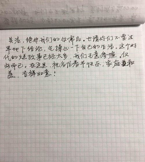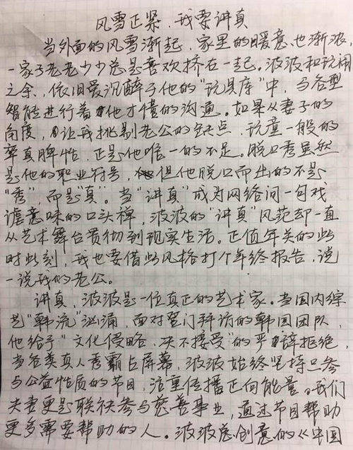 網(wǎng)易娛樂1月26日報道 日前,演員周立波在美國長島因涉嫌持有槍支、藏有毒品而被美國警方逮捕,在繳納保釋金后獲得保釋。此前周立波先是在美國通過媒體表示“持有的槍支合法,毒品并非其所有。之后還曾發(fā)微博自證“事實(shí)和法律將還我清白”。而就在1月26日早上,周立波妻子胡潔通過微博發(fā)布自己的一封手寫信,力贊丈夫周立波“完美”。對于近日的是非,她更表示“請不要過早下結(jié)論,先操心自己的生活”。