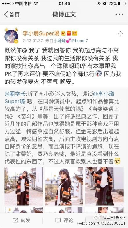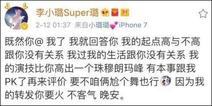 這條微博讓李小璐怒了。李小璐隨后轉(zhuǎn)發(fā)并寫道:“既然你@ 我了,我就回答你,我的起點(diǎn)高與不高跟你沒有關(guān)系,我過我的生活跟你沒有關(guān)系,我的演技比你高出一個珠穆朗瑪峰,有本事跟我PK了再來評價,要不咱倆尬個舞也行,因?yàn)槲业霓D(zhuǎn)發(fā)你要火,不客氣,晚安?!?/p>