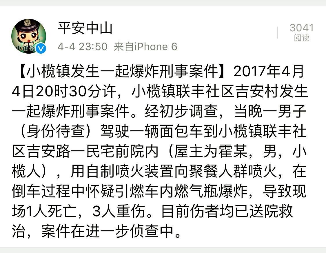 2017年4月4日20時30分許,小欖鎮(zhèn)聯(lián)豐社區(qū)吉安村發(fā)生一起爆炸刑事案件。經(jīng)初步調(diào)查,當(dāng)晚一男子(身份待查)駕駛一輛面包車到小欖鎮(zhèn)聯(lián)豐社區(qū)吉安路一民宅前院內(nèi)(屋主為霍某,男,小欖人),用自制噴火裝置向聚餐人群噴火,在倒車過程中懷疑引燃車內(nèi)燃?xì)馄勘?,?dǎo)致現(xiàn)場1人死亡,3人重傷。