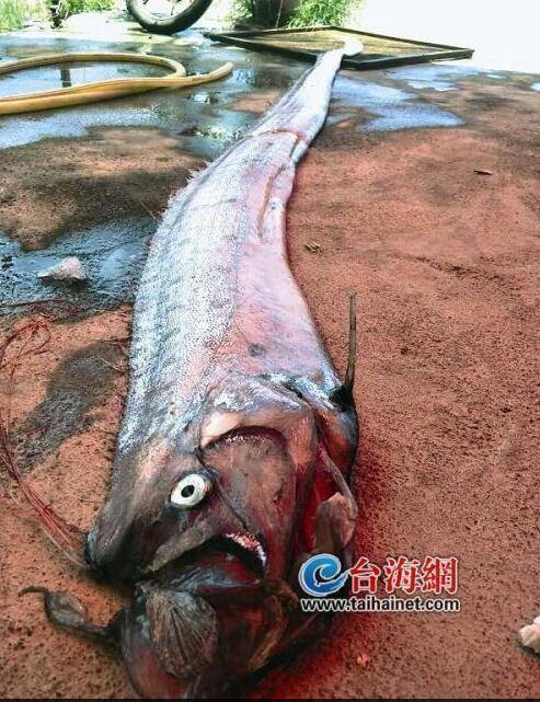 林先生將其拉上岸,他說,這怪魚看起來像帶魚,好像剛死,頭部看起來很嚇人。隨后,他把它撿回村里,村民從未見過這種魚,林先生想把它賣掉,結(jié)果沒人敢買。