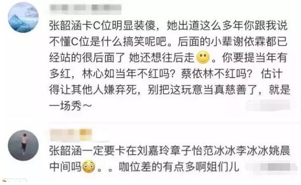 粉絲也在為她解釋:“誰稀罕C位?而且張韶涵也是莫名其妙被擠到中間的~況且人家當年還是小天后級別呢。”