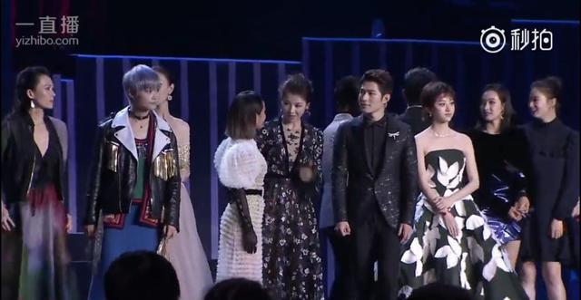后來黃曉明隊和吳秀波隊的人一上來,舞臺上就滿了,而張韶涵的位置從劉嘉玲的右邊換到了劉嘉玲左邊,變成在李冰冰和劉嘉玲中間??梢钥吹剿敃r也還是挺尷尬的。然后李冰冰和張韶涵身邊的劉嘉玲握手寒暄,張韶涵尷尬的站在原地。