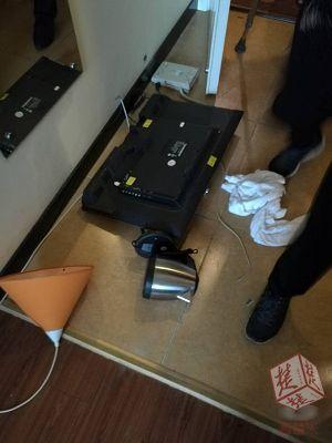 無(wú)奈,酒店工作人員只好用樓層房卡將6038號(hào)房打開(kāi)。打開(kāi)門,眾人驚呆了!一個(gè)沒(méi)穿上衣的小伙子正在玩手機(jī),房?jī)?nèi)的電話機(jī)、電水壺、臺(tái)燈、電視機(jī)都被砸了,甚至連床板都拆了……