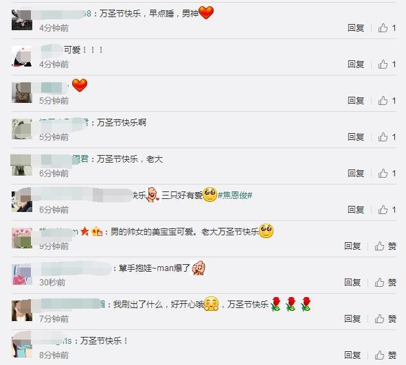 網(wǎng)友也紛紛評(píng)論說:“男的帥女的美寶寶可愛。老大萬(wàn)圣節(jié)快樂”、“老大千鈺姐萬(wàn)圣節(jié)快樂?。?!我在寫作業(yè)里贏來(lái)了萬(wàn)圣節(jié)orz……老大晚上早點(diǎn)睡呀,雖然可能會(huì)有很多小孩子來(lái)敲門說“不給糖就搗蛋”吧,hhhhhhh”